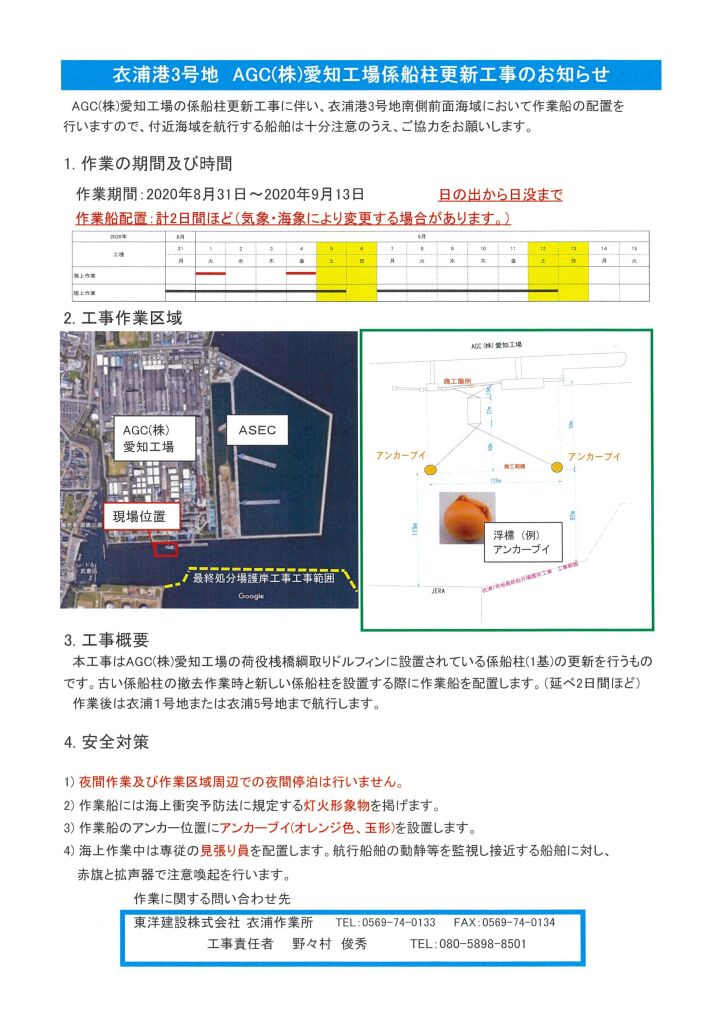 衣浦港3号地 AGC?活、知工場係船柱更新工事のお知らせ