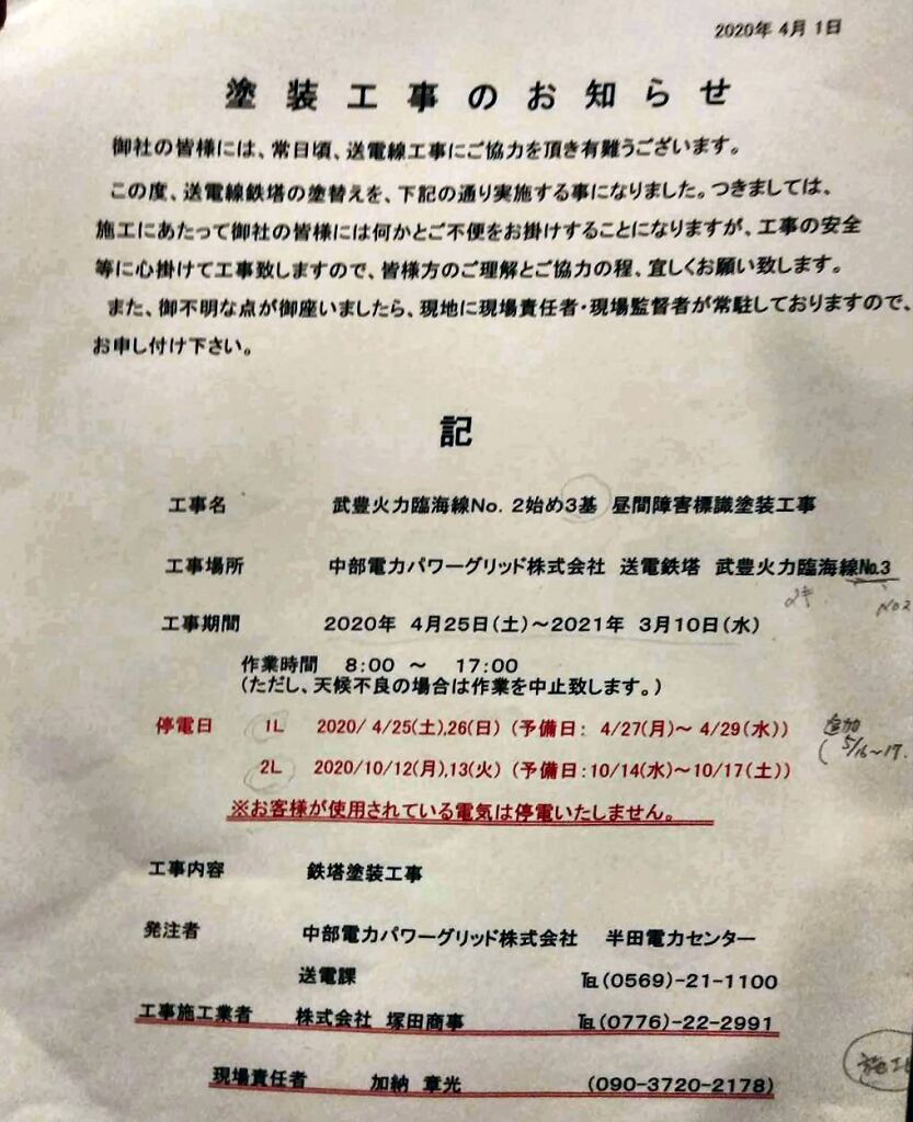 中部電力から鉄塔塗装工事のお知らせがありました。影響のある鉄塔はハーバー東端に隣接する直近の鉄塔(高さ72?b)です。ヨットへの塗料の飛散には最大限の注意を払い施工し万が一の場合は責任をもって対処するとのことでした。