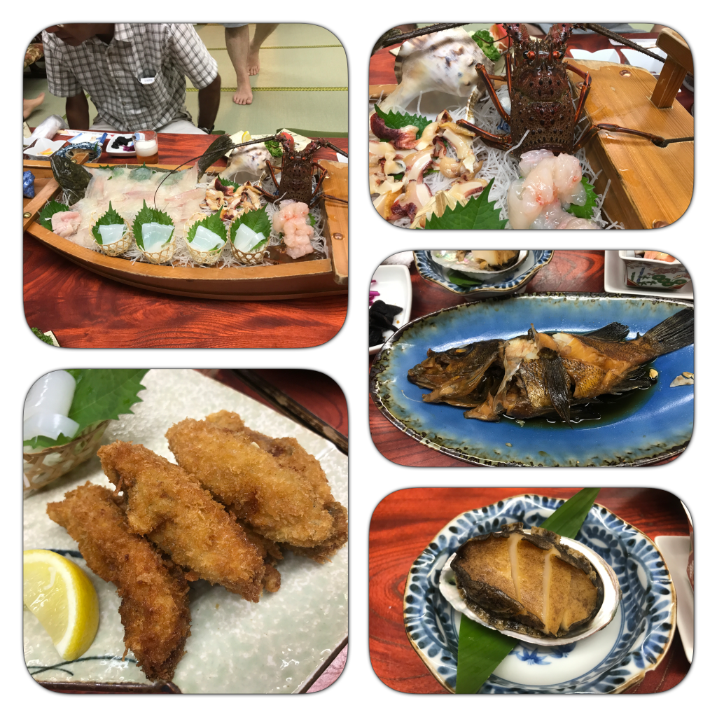 伊勢えびが乗った船盛り・あわび・メバルの煮付け・揚げたてお代わりありの牡蠣フライ・生岩牡蠣など