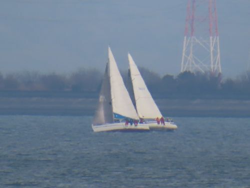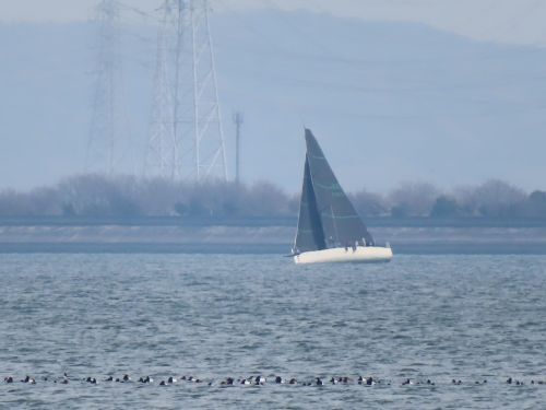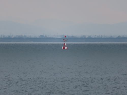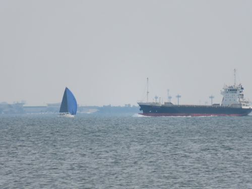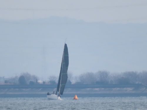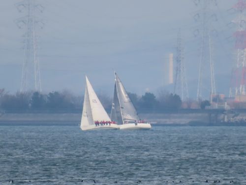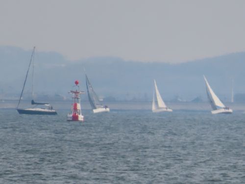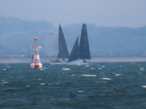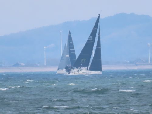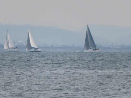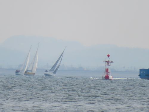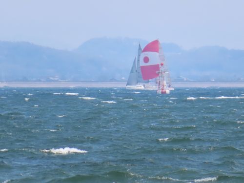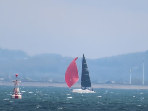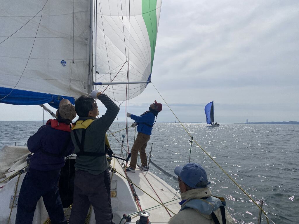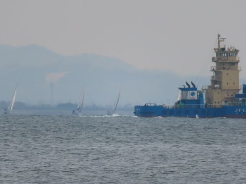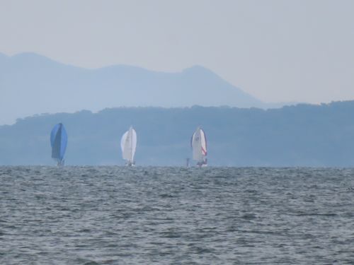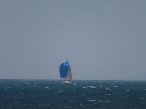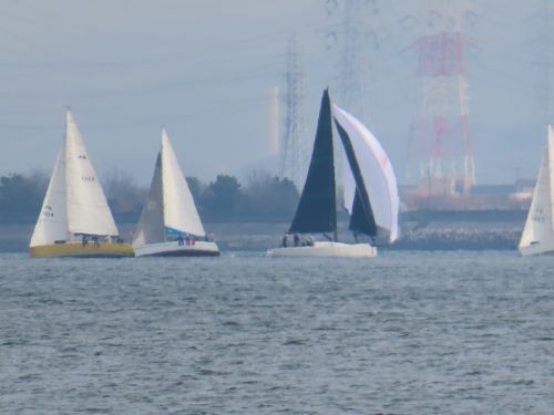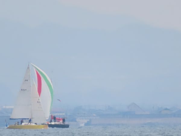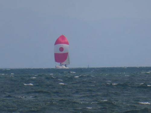 第一マークは3番手で回航 先行艇はジェネカーを揚げている JBはスピンで真っ直ぐ一色ブイへ向ける やや風が上がりスピンシートに手ごたえがいい 7〜8㌩で滑っていく 矢作ブイ手前でサイキの前に出た