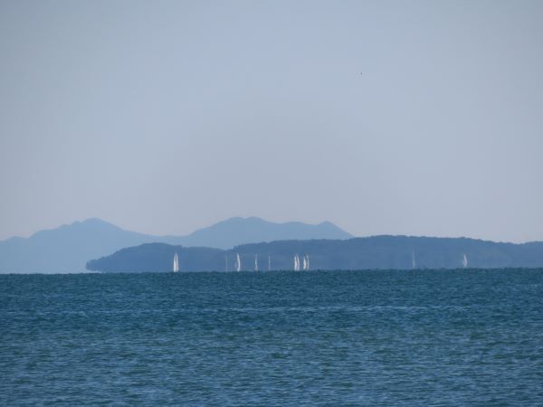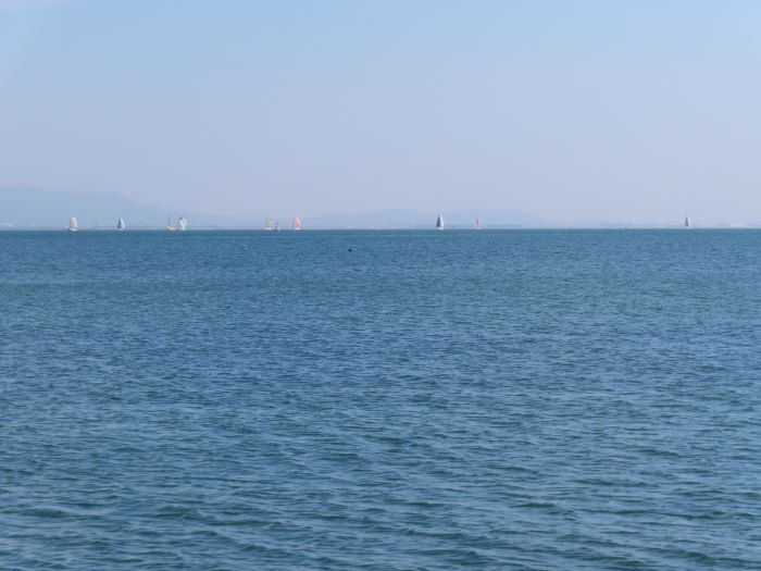 微風でもなんとか続きそうな気配の中、26艇参加でスタートしました。スタート直前に西に振れてポートでのスタートになりました。上マークではいい位置だと思ったらまた振れてバタバタと抜かれてしまう。