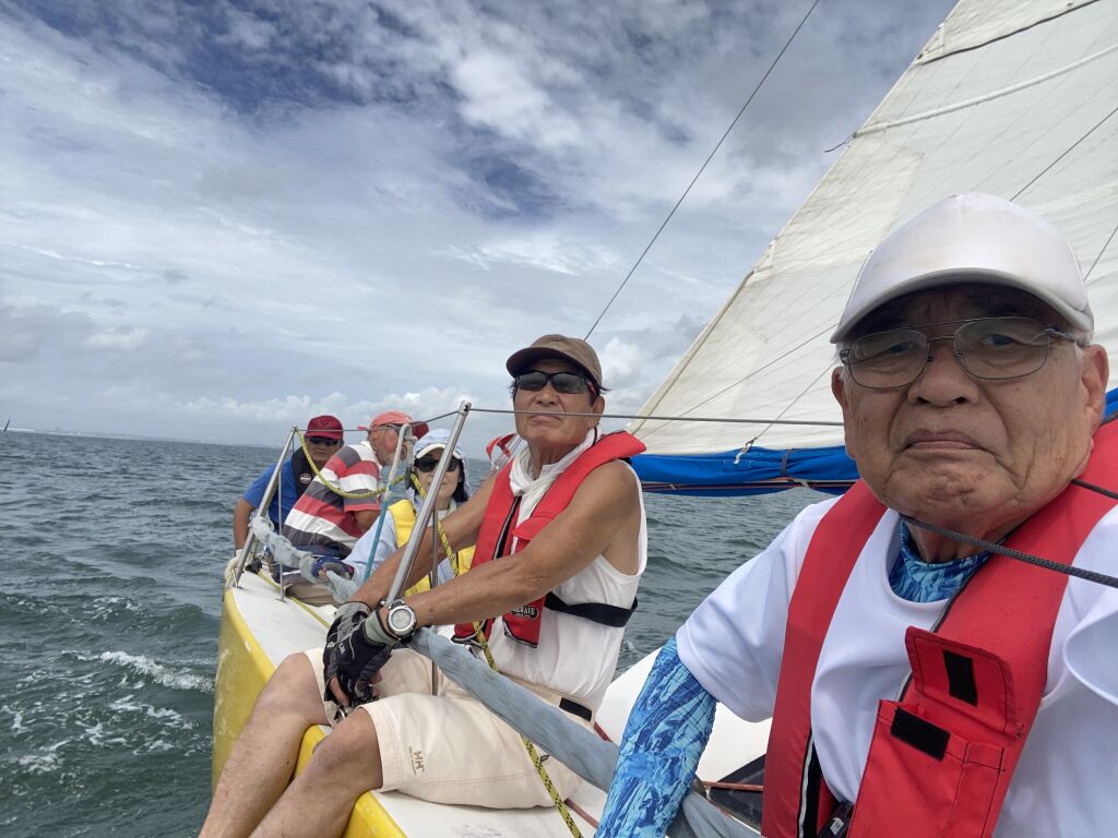 雨予想でしたが日が差してきてやはり暑いレースでした。10〜13㌩の南風で久しぶりに生田ブイまで行く第1レグは快適でした。メンバー不足でエントリーできないかと心配しましたが他艇からの応援で混成チームでの参加でした。