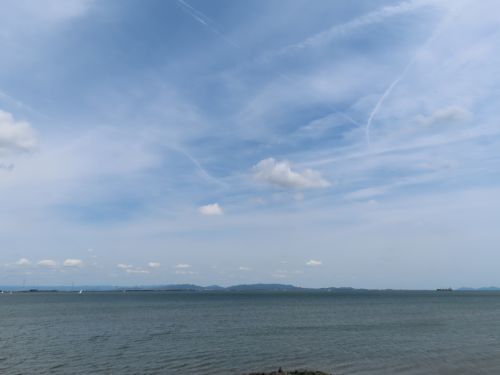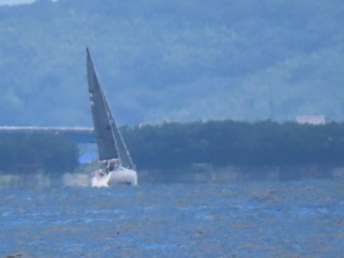 10分後ぐらい。本船が南下していく。その東に、かすかに見えるような?車で、師崎まで行こうかとも思ったが、つまみを買って帰り、家で早めのビールを飲むことにする。(後期高齢者、できるだけ車の運転をしない。)